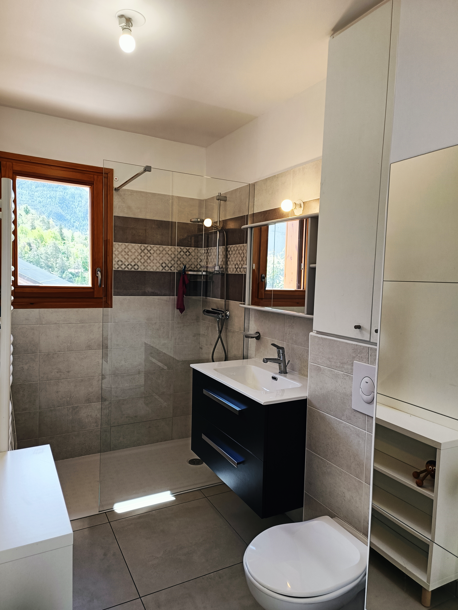 Une salle de douche à l'italienne et une salle d'eau avec WC suspendus complétent cet appartement.